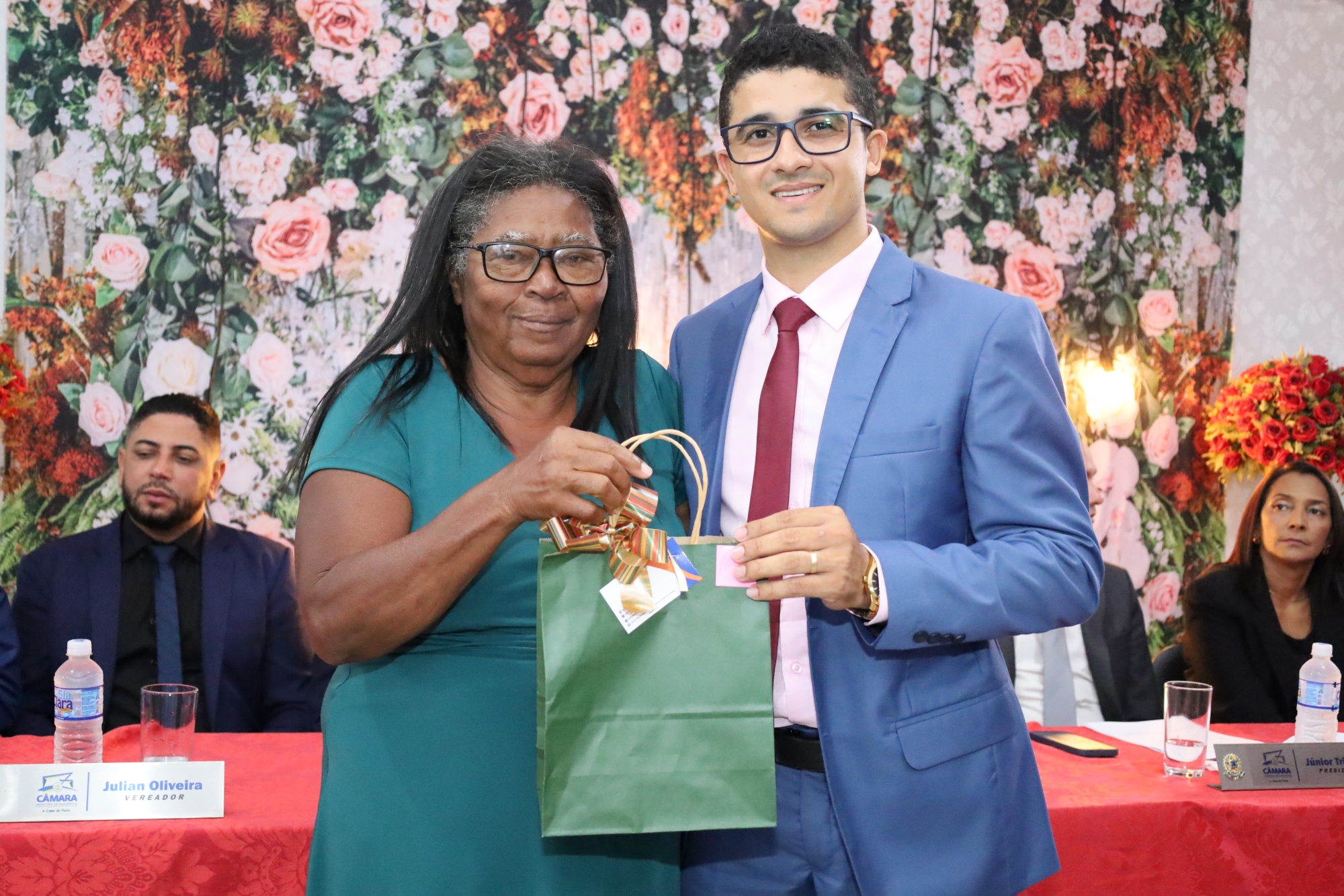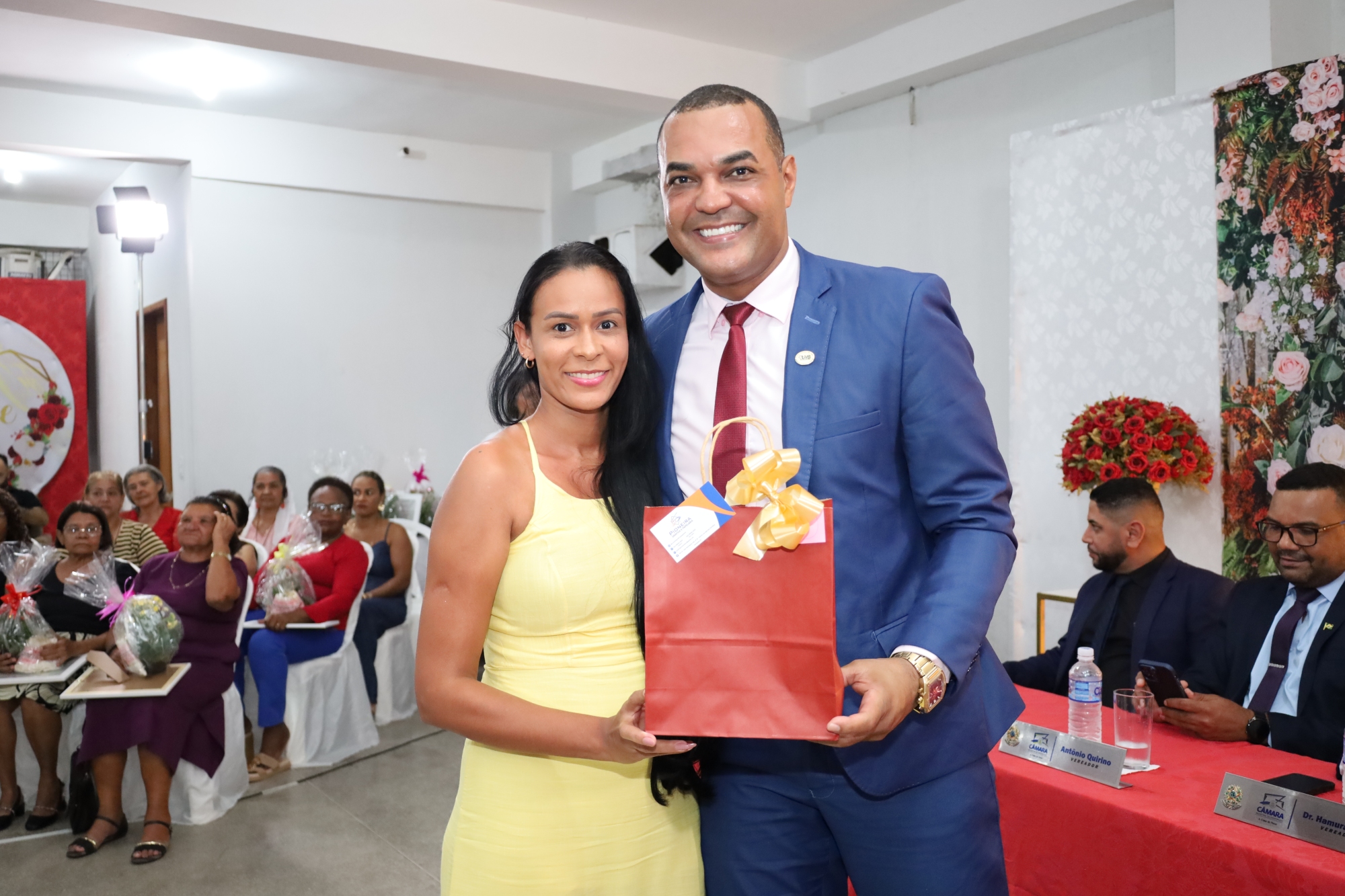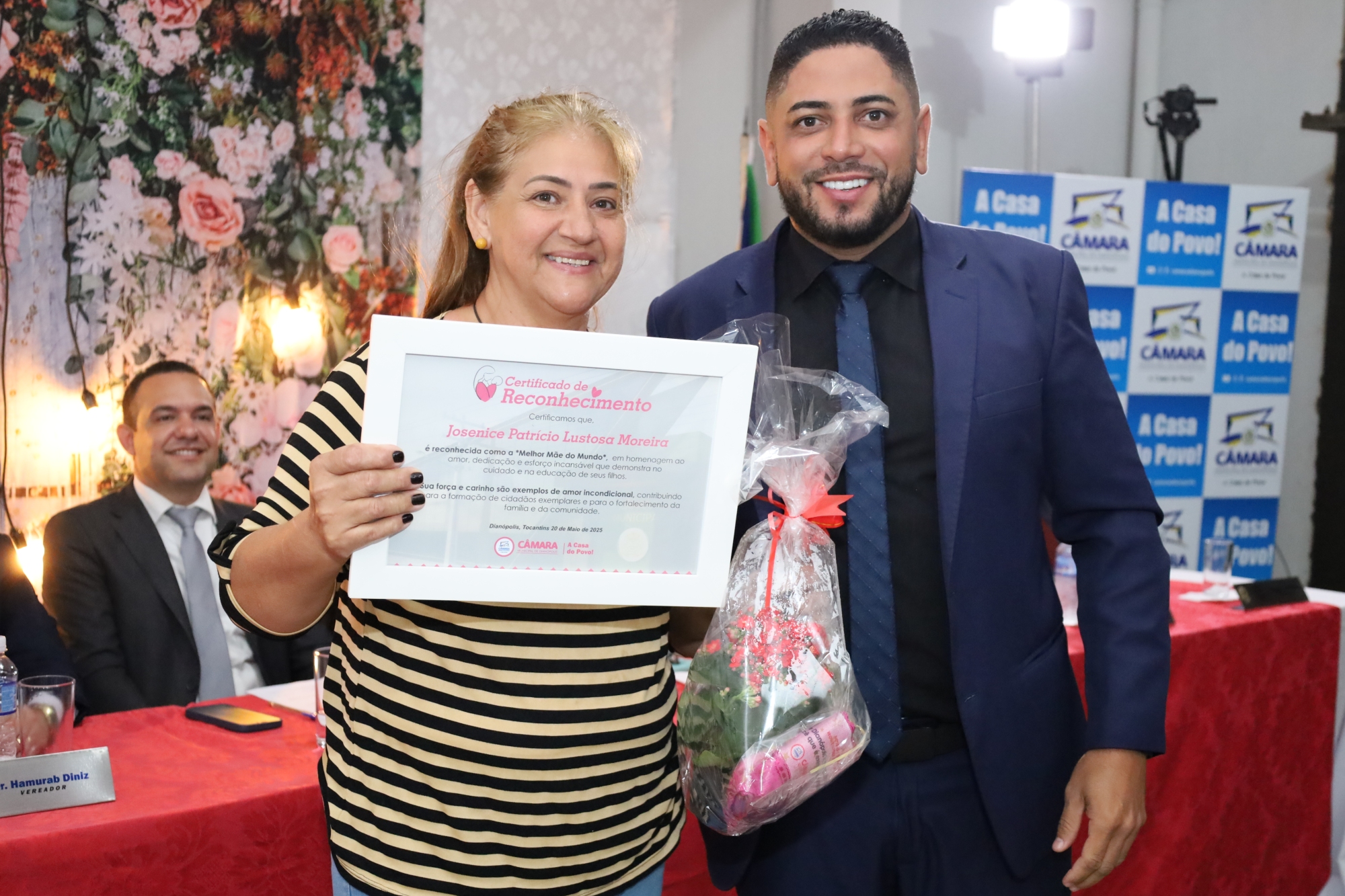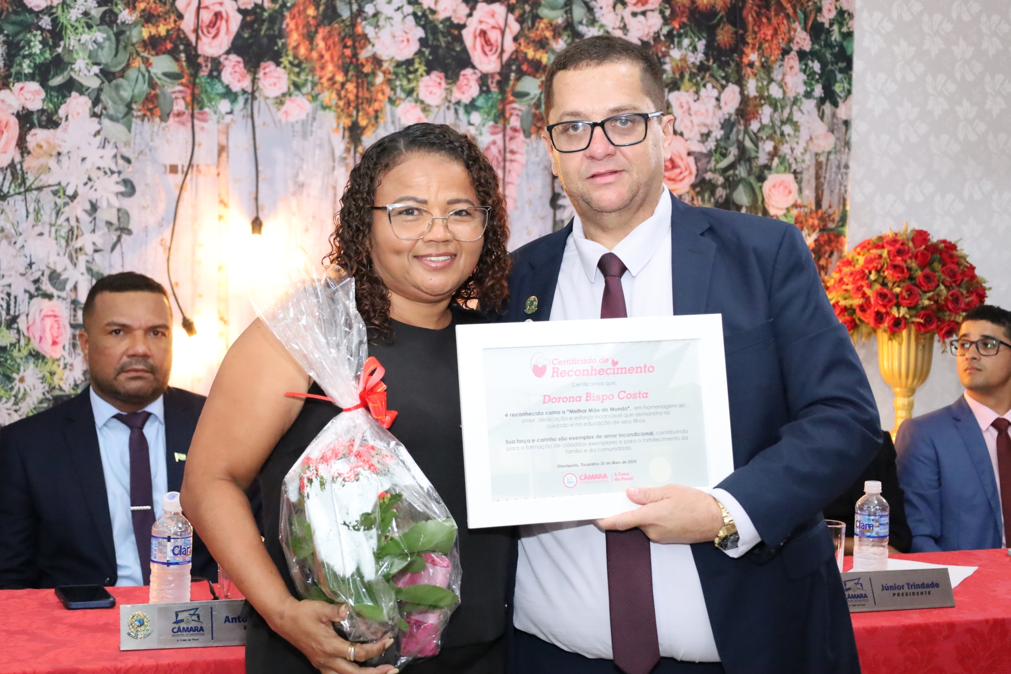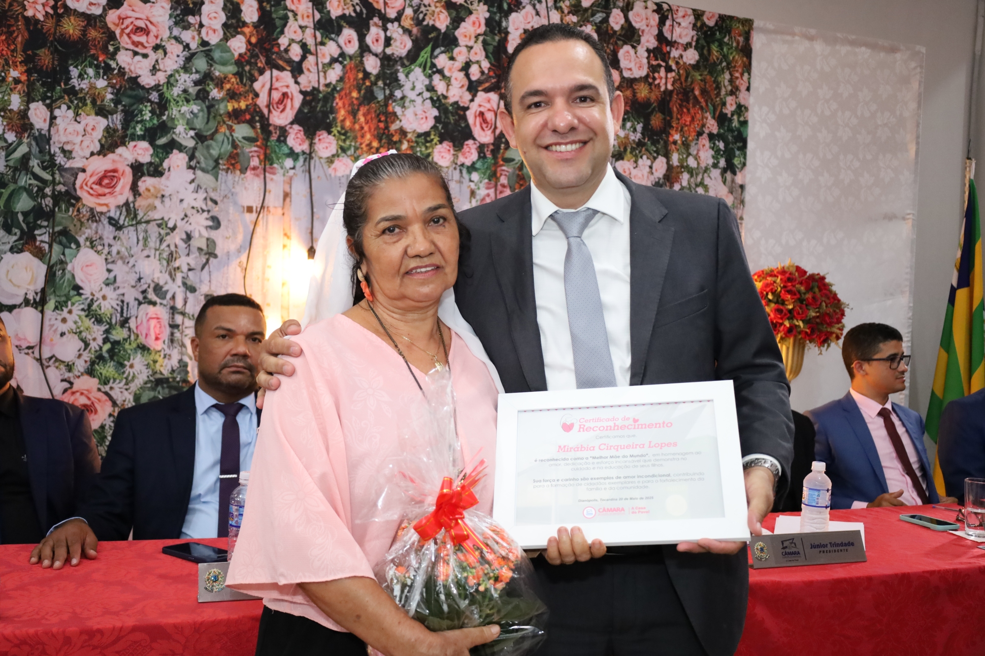 A cerimônia começou com a bênção do pastor Eliardo Santos e do Padre Eldinei, que trouxeram uma mensagem de fé e esperança para todos os presentes. A solenidade ocorreu na garagem da Câmara Municipal e foi aberta pelo presidente, vereador Júnior Trindade, que destacou a relevância da data. “Hoje, homenageamos aquelas que são o coração de nossos lares. As mães são verdadeiras heroínas, e esta é uma oportunidade de expressarmos nossa gratidão por tudo o que elas representam em nossas vidas”, afirmou.